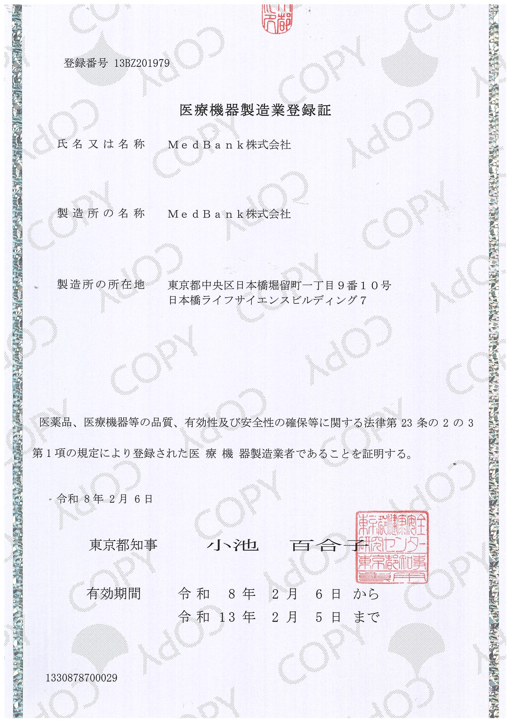 • 製造所の名称: MedBank株式会社